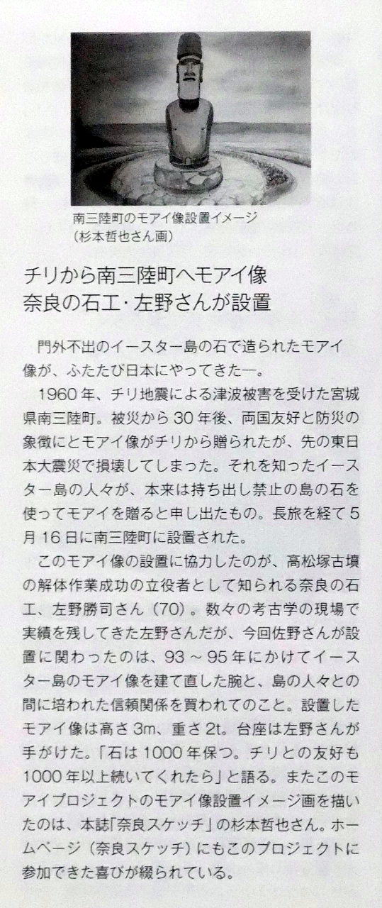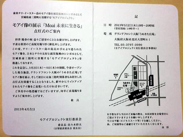 モアイプロジェクトへご参加いただきありがとうございました。杉本さんの描かれた、海を背景としたアフ上のモアイ像は、南三陸町の方々にも見ていただいており、25日の寄贈式のイメージを形作ることができました。これを縁に、モアイと南三陸のことを、心にとどめ置きいただければ何よりです。ありがとうございました。 稲本 都志彦 環境・CSR推進部 復興支援チーム 三菱商事株式会社