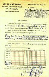アフリカ西海岸のギニア共和国の国内放送を受信したときのベリレターです。現在この周波数ではザンビアの放送が強力に聞こえていますが、当時はギニアでした。紙が黄色になっているあたり27年前を感じます。現在も短波放送は継続されているため、受信可能性はあります。