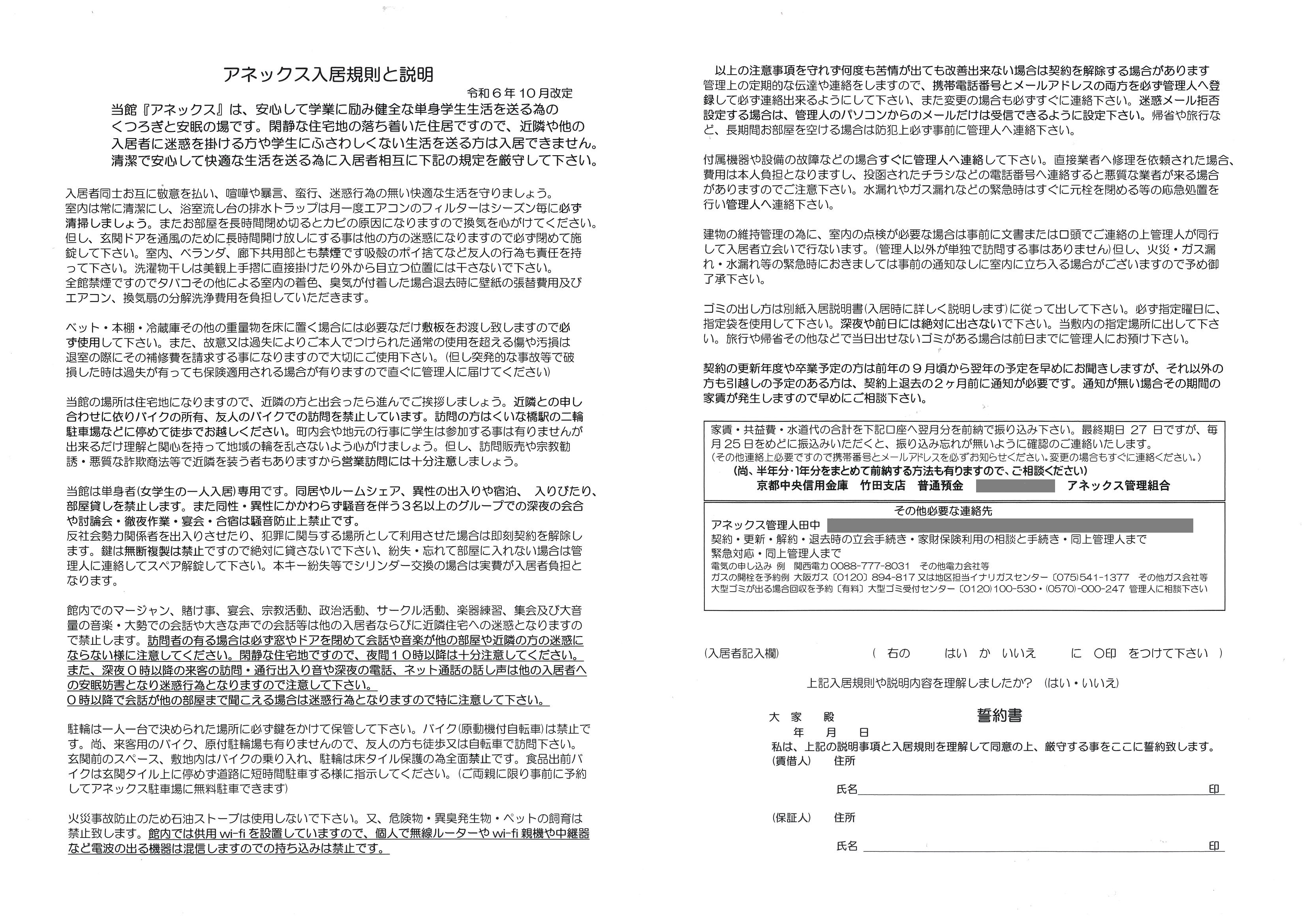 | 入居案内 ブレーメンとアネックスは単にお部屋の提供だけで無く、学生専用で常駐の管理人が初めての一人暮らしを優しく親切にサポートします。 親御様とのコミュニケーションも大切に必要な時はいつでも親御様に替わって相談に乗ったり、お手伝いをします。 引越しのその日からすぐ使える高速光1ギガ・インターネット(無料)と館内高速WI-FI(無料)付きの学生専用マンションです 洗濯機・冷蔵庫・その他の家具家電のレンタル(500円/月当り)もあります(但し新品指定は700円/月当たり) ![]() |