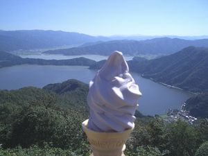 うおおお!!三方五胡が見渡せる! こりゃ上った甲斐がありましたなぁ。そこに謀ったのようにソフトクリーム屋が。美味しいブルーベリーソフトとな。早速買って三方湖と仲良く激写。味のほうは結構なんていうか・・・微妙。いや、美味いんですけど、思っていたブルーベリーとは一線を画す味でした。一回食べてみてください。美味いは美味いです。 ちなみにここの山頂公園には狭いながらもちょっと珍しい昆虫(この日は見なかったTT)や、バラ園、大量の誓いの鍵、めだか村(左下)などが詰め込んであります。五木ひろしの出身にちなんだ五木の園なるものもあり、山頂は常にひろし演歌が流れています(笑)