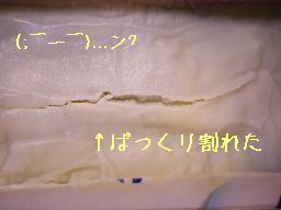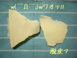 と、、ここまでの前知識はバッチリ。細かいことは気にせず、調べず、いざ作業開始!! 上記の注意事項を忠実に守りつつ、順調に作業を進めるも、途中気を抜きボウルの底から離れた状態でブレンダー作動(>.<) マジデトビチリマス。ご注意を・・・・ そして泡だて器で攪拌、ブレンダーで攪拌を繰り返すこと3〜4回、、、、ええええ???もうトレースが(*_*) 時間にしてほんの5分ほどでしょうか・・・・結構しっかりとしたトレースが確認出来ました。 で、そのまま半分の生地を型に流し入れ、普通のせっけんとし、、 残りの半分の生地から少し小分けした生地でマーブル用の紫生地を作成。 と、ここら辺から異変が( ̄□||||!! 紫色をつけようとカララントを混ぜるのに手間取っている間に、生地がどんどん鹸化。 有り得ないほどにドロドロになってしまっています(>.<) 焦って精油を投入。香りを楽しむゆとりなんてもはやどこにも無し。 さらに焦って紫の生地と残りの生地を混ぜ合わせマーブル模様を作成するも、もうドロンドロン。 一応かる〜〜く混ぜ合わせ、マーブルを目視後、型入れをする。 でも、、、ドロドロ過ぎて型入れが上手く出来ない(>.<) せ、せっかくの綺麗なマーブルが〜〜〜 なんとか型入れするも、表面が波打ちまくり。 表面を平らにするために、ゴムベラで右へ左へ行ったり来たりし、、なんとか型入れ終了。 そしていつもの発泡スチロール箱にて保存開始 ここまで来たらもう大丈夫でしょ〜〜〜♪ 期待に胸を膨らませつつ、暢気に旦那と近所のランチバイキングへ出掛け。。。 ちなみに中華バイキング。ウマカッタ(*_*) そして帰宅後・・・・ とても気になったので、そ〜っと発泡スチロールの箱をのぞいてみました。 石鹸の型に触れてみると、今まで体験したことのないほどに熱を持ってる石鹸たち。 これはマズイかもしれない・・・・ おそるおそる型の中をのぞいてみたら、わずか2時間ほどの間にこんなことになっていました。 は〜〜失敗だ(>.<) あまりにも石鹸が熱を持っているので、発泡スチロール箱のフタを開けたままその後通常通り丸一日放置。 そして24時間後、通常通り型出しを敢行。 ラベンダーの方は意外と綺麗な出来栄えでした。ぱっくり割れて盛り上がった部分以外は特に問題なし。 普通の子の方はと言いますと、、、何故だか脱皮したんです。何これ?? この写真は一部の皮。本当は石鹸丸ごとこのようにツルリンと剥けてしまったのであります。 しかもこの皮、結構弾力があって固いんです(>_<) 剥けたあとは普通の石鹸よりややざらついた感じの石鹸がお目見え致しました。 でもメゲずに負けずに、これらのきも〜〜い部分を削除して、なんとか冒頭の写真にような綺麗な石鹸の姿になりました。 メデタシメデタシ♪ ●作成後に感じたこと、わかったこと●