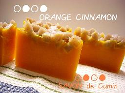 オレンジの石けんに小さく切ったシナモン石けんをトッピング。クローブに見立ててみましたが・・