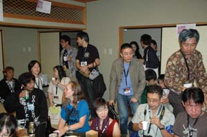 で、挨拶と乾杯の後パーティーが開始されるがとにかく盛り上がる。言葉が通じなかろうが片言というか適当に単語を並べら程度の英語モドキで意思を伝え笑っている。しかし、開始後にもどんどん人が入ってきただんだん座るスペースもなかったので少しずつ動いていくが、エアコンの容量を超える蒸し暑さに耐えられず廊下へと離脱する。
