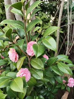 | 左下の紅梅が3週間後にはこのように花をたくさん付けた。昨年は0℃以下になることがなかった、今年はこの間に最低気温が-4℃、日中も0℃以下の真冬日が何日かあった。このように寒い冬だが、植物はその時を知って花を付けている。(R3年1月25日) | 例年、年末に咲き始める紅梅が今年も花を開き始めた。(R3年1月3日) |
