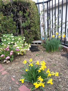 | 今年はボケの花の数が多い。カイズカの側に植えたのが間違いで、毎年、この後葉の病気が出る。(R7年4月13日) | スイセンが咲いた。球根なので毎年、同じところに同じ花が見られる。(R7年4月11日) |