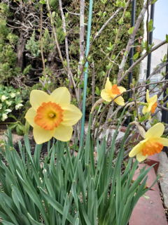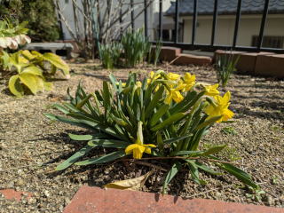 | 丈の高いスイセンがやっと咲き始めた。丈の低いスイセンから遅れること約2週間。(R8年3月23日) | スイセンが咲いた。これは丈が低く花も小ぶりだ。奥の丈の高いスイセンはまだ咲いていない。(R8年3月10日) |
