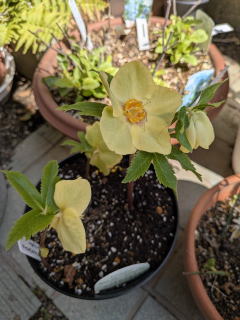 | 白色のボケ。今年は花をたくさんつけた。(R5年4月1日) | これは薄い黄色のクリスマスローズ。色は白から次第にグリーンに変わっていく。(R5年3月28日) |