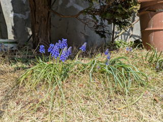 | 黄色のクリスマスローズ。クリスマスローズには色の違うもの、これのように一重のものや八重のものなど、種類がいろいろあって楽しませてくれる。(R8年3月24日) | ムスカリが咲いている。(R8年3月23日) |