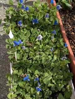 青色の花はライムと同じ時に購入したアズーロコンパクトという。絶え間なく花を咲かせてくれているのでありがたい。この花にチョウチョがが蜜を求めてやってきた。この時期、庭にはさまざまなチョウチョがやってくる。しかし、バラに卵を産み付けられるのは御免だ。(R2年10月13日) |