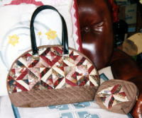 | 買い物などに重宝な手さげ。皮ほど大層でなく、布1枚モノの手さげよりしっかりしてます。左は「ログキャビン」。暖炉をイメージしたパターンです。33×35cm。 |