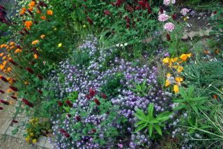 暗い赤とピンクのナデシコと、オレンジ色のカリフォルニア・ポピー(花菱草)。まぶしいようなオレンジ色、好きです。ナデシコって色の種類が多いなあ。 | |