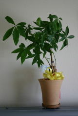 パキラ。これも職場の方たちからのいただき物。最初は2〜3枚だった葉っぱも増えてずいぶん大きくなった。冬に水をやりすぎたのか、かなり葉が落ちて心配していたが春になってどうやら持ち直したかな?つやつやした新芽がかわいい。 右は2年後'05-1の状態です。 |
