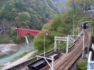ここに来た目的の一つ、黒部渓谷鉄道(トロッコ列車)。さっそく小高いところから偵察。く早速 | |