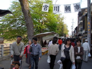| 翌朝、Y母念願の「朝市」へ。川のほとりで開催される「宮川朝市」で甘くない手作りのお漬物や珍しいお菓子、髪飾りを買いました。 | ![]() |