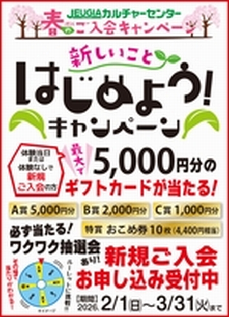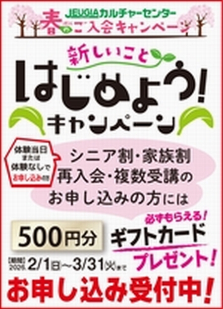 JEUGIAカルチャーセンターでは2月1日から3月31日まで「はじめよう!キャンペーン」を実施しています!