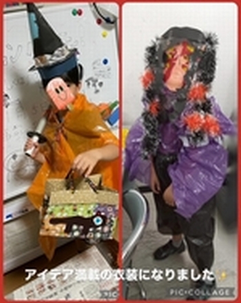 被り物や衣装を考え沢山の素材から創り出しました。脱いだり着たりできる仕組みを考えた個性あふれる衣装ができました!作った衣装を着てハロウィンパーティーを楽しみましたよ!