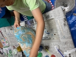 水と油の性質を使い、水の上に油絵具をたらしてきれいなマーブル模様を創り出し紙に定着させました。乾いた後は、出来たマーブル模様をじっと見つめ見えてきたものを描き足す絵画を楽しみました。
