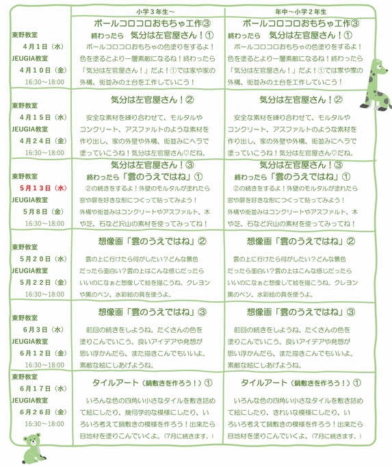 ※お休みの場合は出来るだけ早くお知らせ下さい。補講はございませんがなるべくお子様の納得のいく作品に仕上げてほしいため、ご本人の気持ちをお聞きし、次の内容でも前回の内容をするなどの柔軟な対応をいたします。