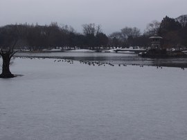 周囲約780m三島池。水面が静かなときは美しい「逆さ伊吹」が見られる。