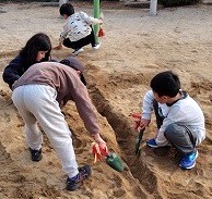 | プレイリーダーより 12月は個人懇談日に4日間、遊ぼう会を開催し、延べ340人が参加しました。子どもたちは野球やサッカー、ドッジボール、ドッヂビー、テニス、鬼ごっこなど、思い思いの遊びを楽しんでいました。砂場では一生懸命に穴を掘り、トンネルを作って水を流し入れていました。「寒くない?」と声をかけると、「寒くない!」と元気な声が返って来ましたね。 1月も遊ぼう会で元気に遊びましょう。 ![]() |