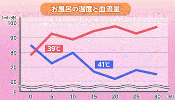 お湯の温度が「39℃」と「41℃」のお風呂に30分間入浴したときの血流量の比較です。
