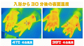サーモグラフィーでも、手の温度は39℃の入浴の方が高くなっています。