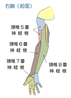 広い範囲に痺れや痛みが見られる場合は頸部(けいぶ : 首)を疑います。