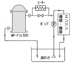 MP-FILTERは通油量として100〜1500L/Hまでの機種を揃えておりますが、一般的には循環ラインのバイパスフィルター又は油タンクの側流正常として使用します。 |