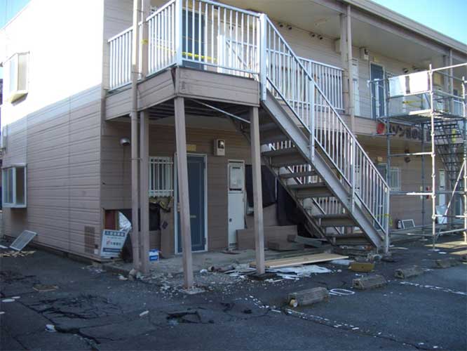 震度7の本震によって階段が落下し、2階の居住者は避難不可の状況に陥った