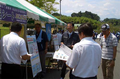 炎天下にて、行政関係者が熱心に防災用品のパンフをチェック