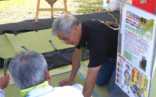 市議らが「防災備蓄畳」の説明に聞き入る