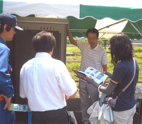 行政関係者と消防団員が「折りたたみ更衣室」の説明に聞き入る