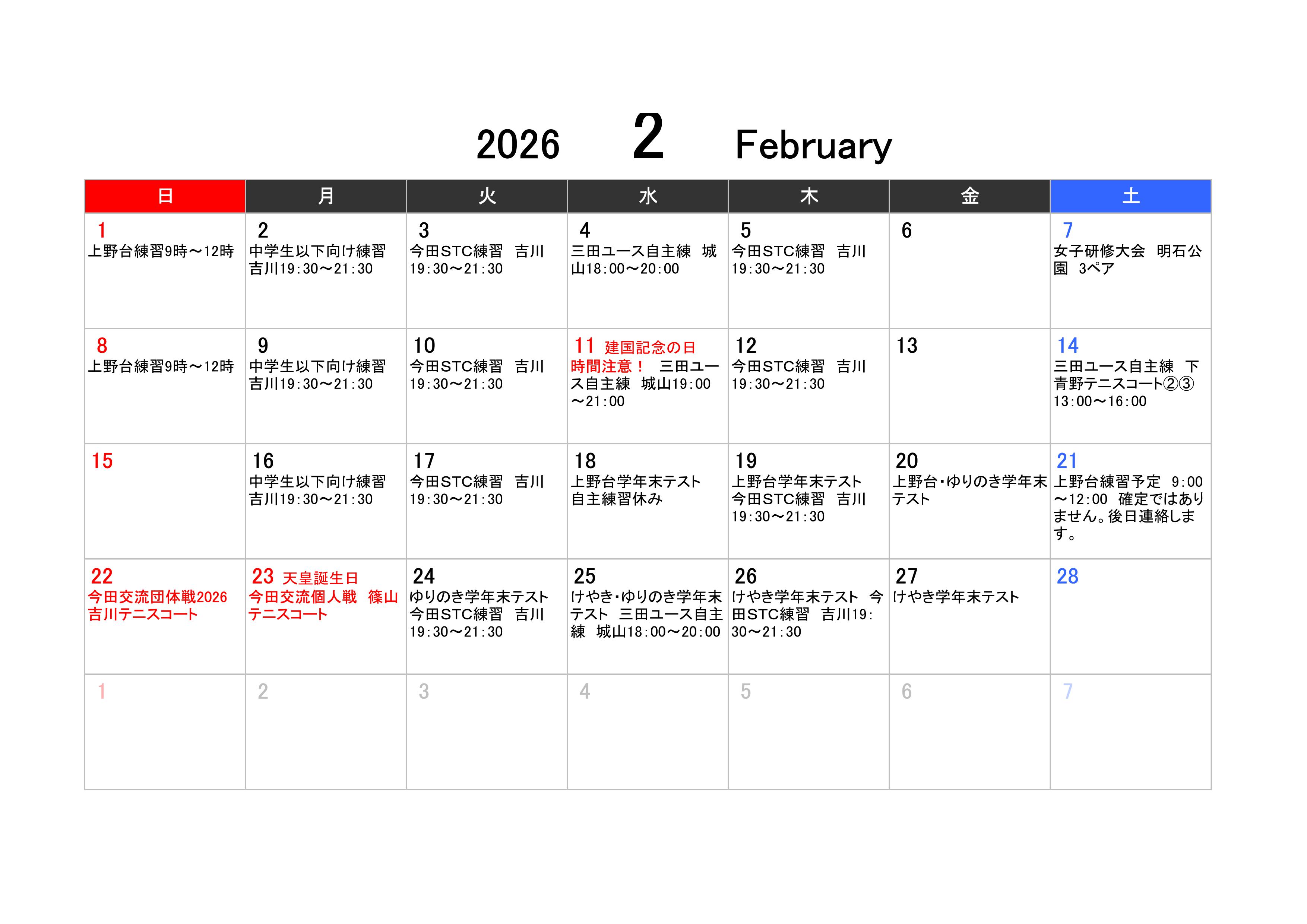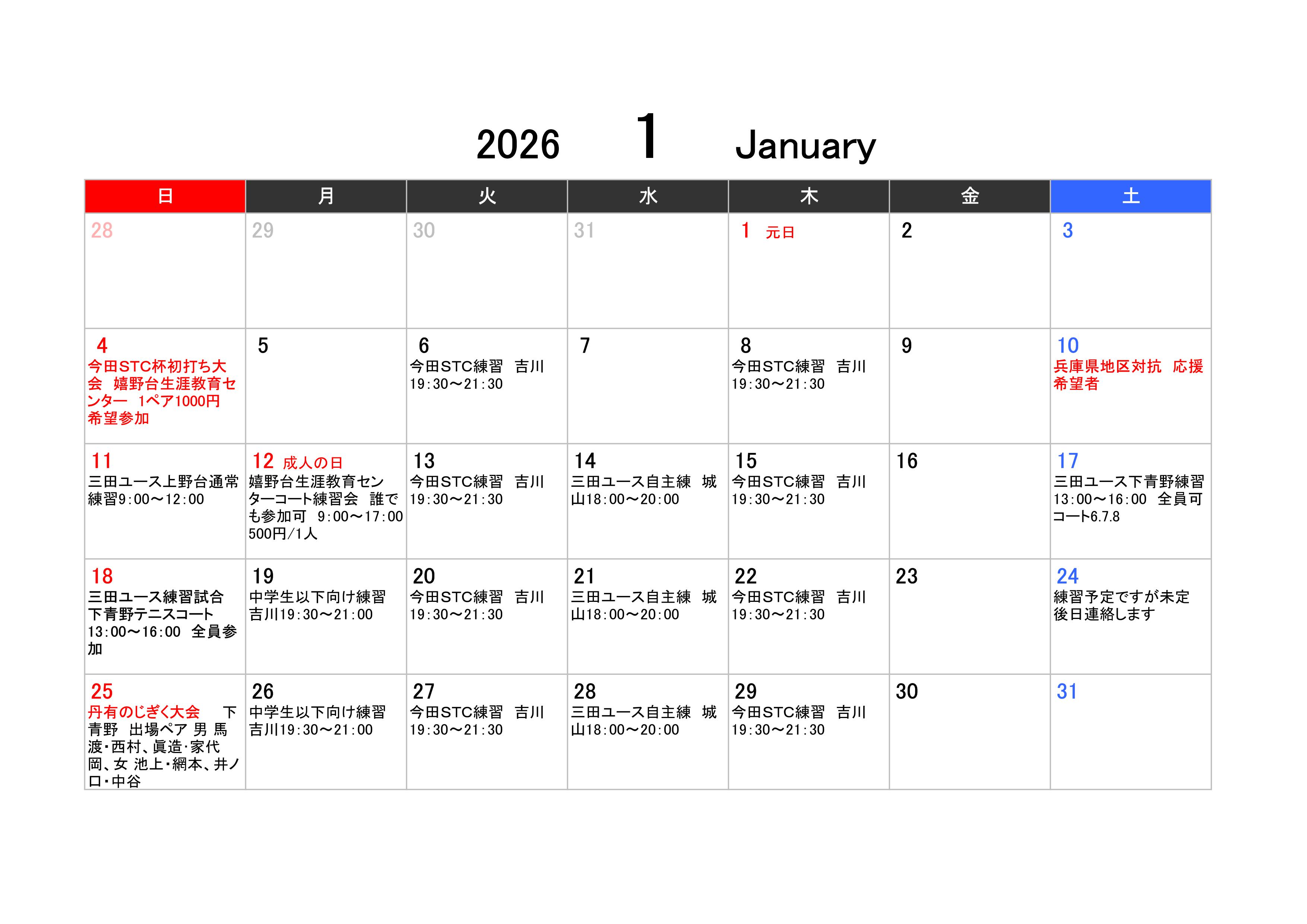 2026年1月の予定