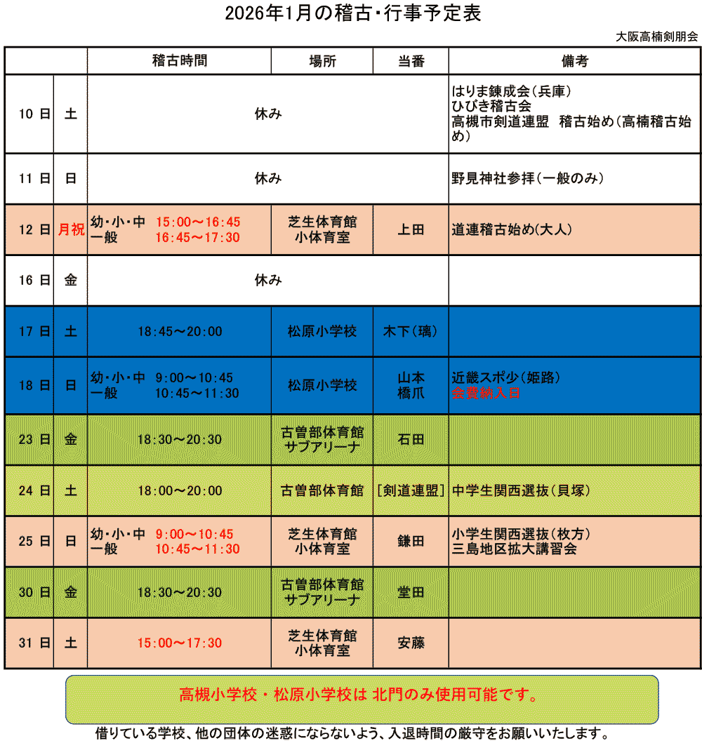 ※台風接近などにより、上記時刻に「北大阪」に【警報】が発令されている場合は、稽古を中止します。
