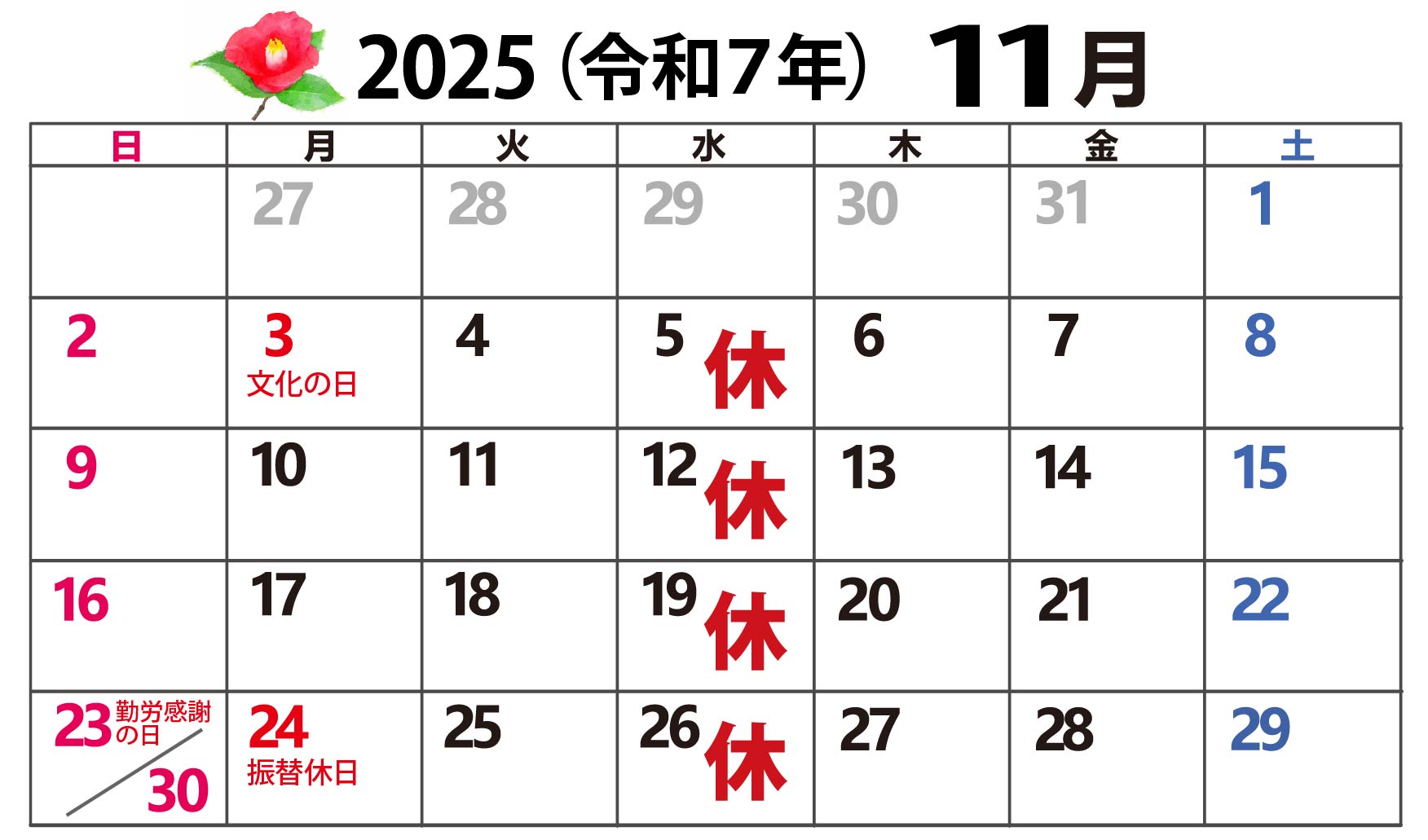 ![]() 令和7年11月の休業日。水曜日は定休日です。 |