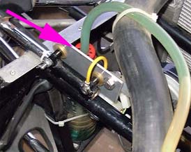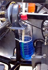キャップに空気抜きの穴を開け、ホースを斜めにカットし底まで挿入、 クーラントを1/3程度入れバッチリ。キッコーマンのキャップは二重でホ ースのホールド性が良くグッド。