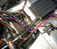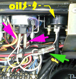 三列目左の画像上(メーター裏)のピンクの→の所で電源分岐を取 り、メーター取り外しの為にグリーンの→の所でジョイントを作りま した。