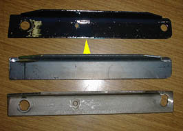 購入当初サイド出しマフラーステーを購入したんですが、既 設のステーの穴位置が合わず、穴を開け直して装着して いました。それが、元の穴と瓢箪型につながっている ため、振動でボルトがいびつに削れやすく、もう少し で折れそうなのを発見。無理なく取り付けできるよう に作り直しました。