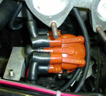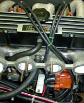 実は、そのままキャップ交換だけでOKと思っていて、かぶせて見るとあさってを向きます。 鈴商へ問い合わせた所「1番を上死点へ持っていって、デスビを取り外し、丁度良い角度に なる様、何回か付け外しし調整すると割合簡単ですよ。」との事。 キャブは外して作業した方が楽ですね。きっと手練れはそのままでしょうけど。3回程で 取り合えずの位置に決定。 プラグコードの取り回しは長さの都合で下の画像の様になりました。 今回は、予算の都合でコード交換は見送り。ノロジーホットワイヤーをチョイスのつもりです。 エンジンを掛けると、ひどい不整脈ですが、取り合えず回るので、大きく間違っていない 事を確認。 デスビを感覚で5度位前後させ、取り合えずアイドリングするまで仮調整(2度位でした)。 今回は、沼崎師匠のジャンブルの記事を参考に12度としました。 (記事では14度だったんですが、ブロックに12度までしか無くて、目分量で調整するの がイヤだったので。) キャブを外したので同調とアイドル調整をして完了。やっぱ4連負圧ゲージがあると作業が 早く、確実。 アイドルを600回転にしても安定しています。若干低速の付きがワンテンポ遅れ気味、 3000からの吹け上がりは良いので、高回転を多用する方はこのぐらいで、町乗り主体は 8〜10度位でも十分かも。 |