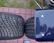 | 今回のホイールは、以前名古屋の部品交換会で4本五千円で購入した中古品で、元はサニト ラにハメていた物。新品を購入される方はベストを追及されてはと思います。 |
