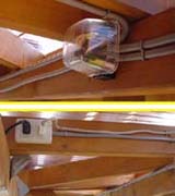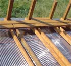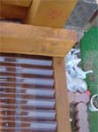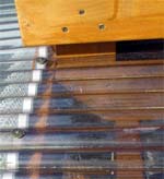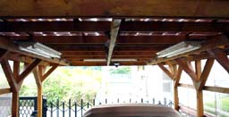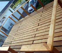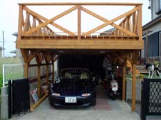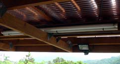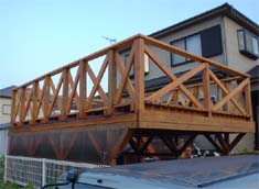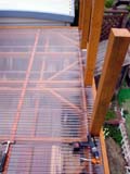 <上の画像が屋根・デッキ関係> 波板は耐久性を考慮してポリカーボネートをチョイス。3.4m幅で5cmと、こう配があまり取 れず、流れが少し悪いのがご愛嬌。 私の愛用ホームセンターには3.4mの波板が無く、1.8mを2枚使用し真ん中で合わせていま す。こう配が無いので、強風の時は雨水が逆流し、継ぎ目の隙間から雨漏りがする ので、今回シリコンコーキングで漏れ止めを行いました。 デッキ部分は2*6を使用し、ガレージに光も採り入れたいので、間隔を少し広めの2cm 幅にしてみました。 しばらくポリカだけの屋根で作業をしており、明るく快適だったので、デッキを張る と相当暗くなるのではと思っておりましたが、そうでも無く、日陰で夏はかえって 涼しく快適です。 |