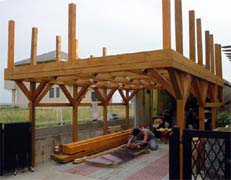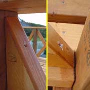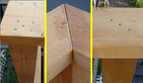 <上の画像がベース関係> 前回のウッドデッキの方が形も複雑で、面積も広く、今回2度目でもあり2日間位 で作成のつもりでしたが、ベースの柱3m×8本を真っ直ぐ立てるのに1日、ベースの仕 上げで2日掛かりました。 金具は、前回使用したシンプソン金具をメインに今回も使用。DIYの国アメリカ物らしく素 人でも施工し易く、耐久性は抜群です。 (お気づきの方もおられると思いますが、最後の画像H1の取付けが間違っています 。正しくは「02ウッドデッキ」のページを参照下さい。) |