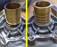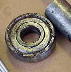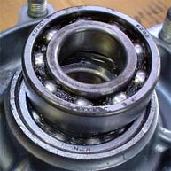 プーラーは奮発して前回購入済みで、ベアリング取外しは楽々。 挿入はセオリー通り古いベアリングを当てて面まで、押込みはソケットの駒。ハブベアリングは大きく、 ソケットの駒では無くフロントフォークシールを打込むホースジョイントを流用してジャストサイズ。<ホント何でも使え ます>