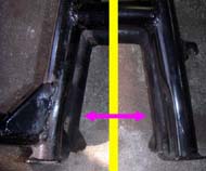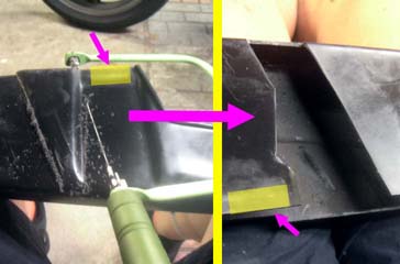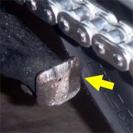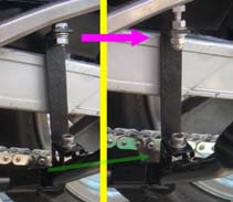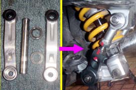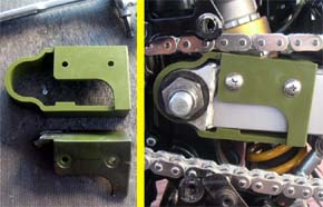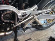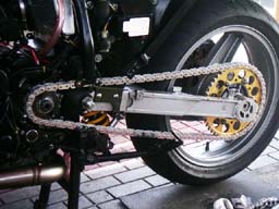 細かい所をまとめて | 1.チェーンガイドが経年変化で硬化し、下半分が欠落していたので今回新品に交換。 2.チェーンはケースと干渉しませんが、ワイドになったタイヤが干渉。ケースの固定(黄色)部分を残して干渉部分をカット。 3.17inc化で低くなったリアを、調整式のリンクで通常位置より少し高めに調整。(今までチョット後ろ下がりで、見た目が今一だったのでほんの少し)このタイプは、センタースタンドが装着出来るのでgoodです。 ※今回は予算の都合でリンクで調整しましたが、リンク比を維持するのが本来の正当な方法だと思います。具体的には車高調整が可能なショックで調整する方法で、車高調整が可能なショック購入が必要になります。 4.ステッププレートを取付けて完了。