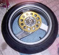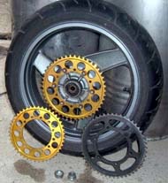 /60-17 BT090で度迫力!(って最近普通か・・・)で感動〜。 | スプロケは、F17/R46で、計算上はレブリミットで駆動力を使い切るセットですが、Fはノーマル新品 のストックを持っていたのと、Rは今回購入のホイール付属でほとんど新品のAFAMを使用と、実 は有り物チョイスです。