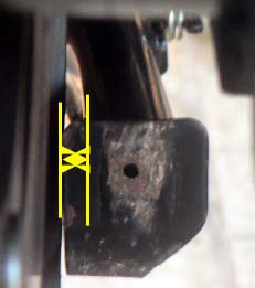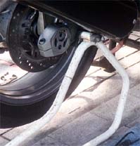 ここからセンタースタンド交換で、レーシングスタンドを使用します。このスタンドは、以前所有していたNSR250R用のホンダ純正工具で、調整幅一杯でGPZ900Rでも使えます。 | ホイールを仮組みした際、センタースタンドとタイヤが干渉する事が発覚。たまたま今のセンタースタンドが錆・汚れがあり、A10の中古を勢いで買っていたので、比べて見ると、1cm程ワイドになっています。取付けて見るとタイヤとの干渉も無くラッキー。 ラストの画像は、忠雄のマフラーに付属のステーですが、センタースタンドとチェーンが干渉するので、ボルトで調整。