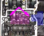 レーナーに液体パッキンらしきダストが結構付いてました。 問題のポンプは赤いエリアの裏に有るのですが、固定ボルトを外しても なかなか外れません。 原因は、画像左→のOILポンプ駆動カムがたまたま真横を向いており、 ポンプを収めるクリアランスがギリギリで、OILポンプを大きくズラス事が出来ず シャフトがなかなか外れなかった為でした。画像右の青いエリアにウォーターポン プが付きOILポンプを介して駆動されます。 画像は有りませんが、OILパンを組んでNEWエンジン完成。