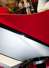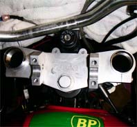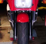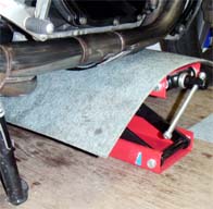 レートのスプリングに変更してみました。 今回は、エンジン積替えで使用したフラットジャッキを利用して左右同時に作業しました。 整備書では、アンダーカウルのままフラットジャッキを当てる様になってましたが、重量がかか ると割れそうで、アンダーカウルは外してマフラーで上げました。 フルボトム状態でOILレベルを測るんですが、下の画像の様な状態です。 |