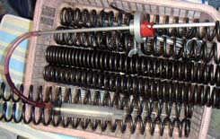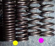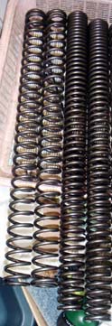 響きリズムを取り難い感じでした。 今回装着は、「プログレッシブ」のプログレッシブレートのスプリングをチョイスし、初期ストロークで デリケートに、奥でシッカリ感を狙います。 画像1.2枚目が新旧スプリングで、黄色がプログレッシブ、ピンクがノーマルです。プログレッシブ は中古購入で、スプリングのみしか送られてこず、自由長がノーマルよりずいぶん長いの で少々不安。専用のカラーが付いてたりするんですが・・・。アフタースプリングは、OILレベル もノーマル設定と違う場合も多いんですが、これも不明・・・。 取合えず、ノーマルOILレベル、ノーマルカラーで組んでみました。OILレベル調整は、画像の 測定器で調整。 |