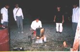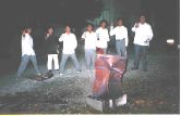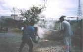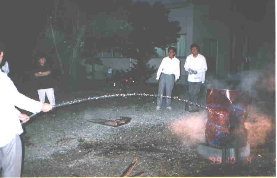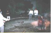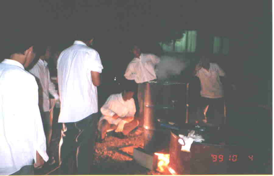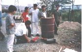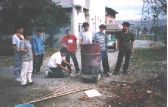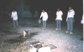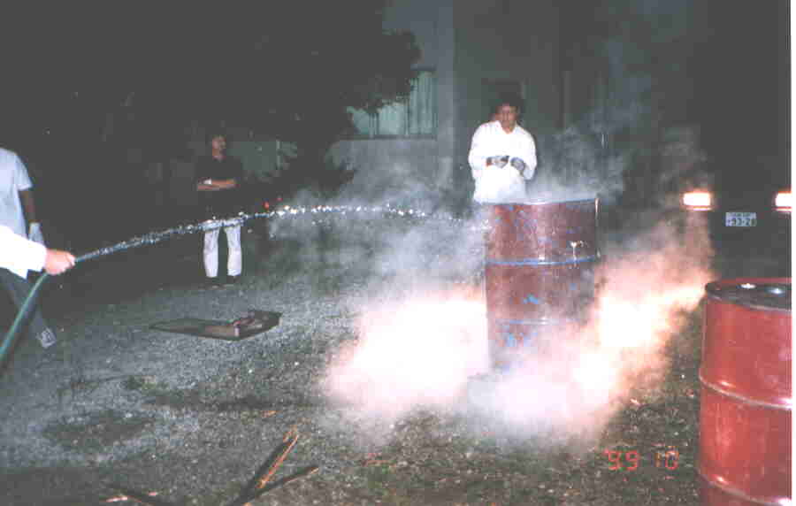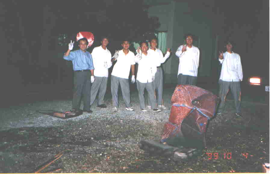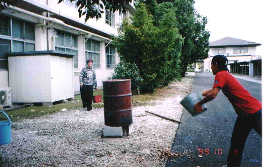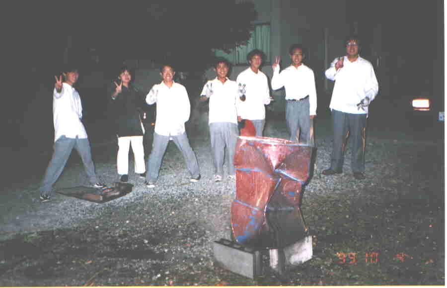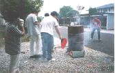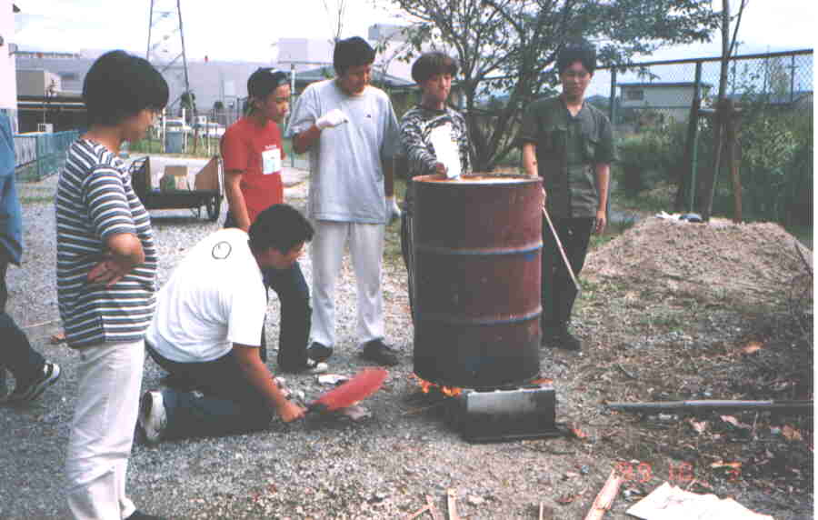 文化祭直前の予備実験では2度の失敗(P1−4)。翌日場所を変えて3度目に挑戦。これも失敗(P5−10)。灯油缶つぶしで気分転換(P11−12)。いよいよこれが最後と、ドラム缶の栓のパッキンを交換し、火力を強め再度挑戦。あたりも夕暮れとなって自動車のライトでライトアップ。ホースとバケツで水をかける。やっぱりダメか(P14)...とみんなのつぶやきが聞こえた直後、”ドッ、ドカーン!”という大音響と共に見事つぶれた(P15)。で、本番ではというと想像にお任せはます。(ドラム缶奮闘記) | ||